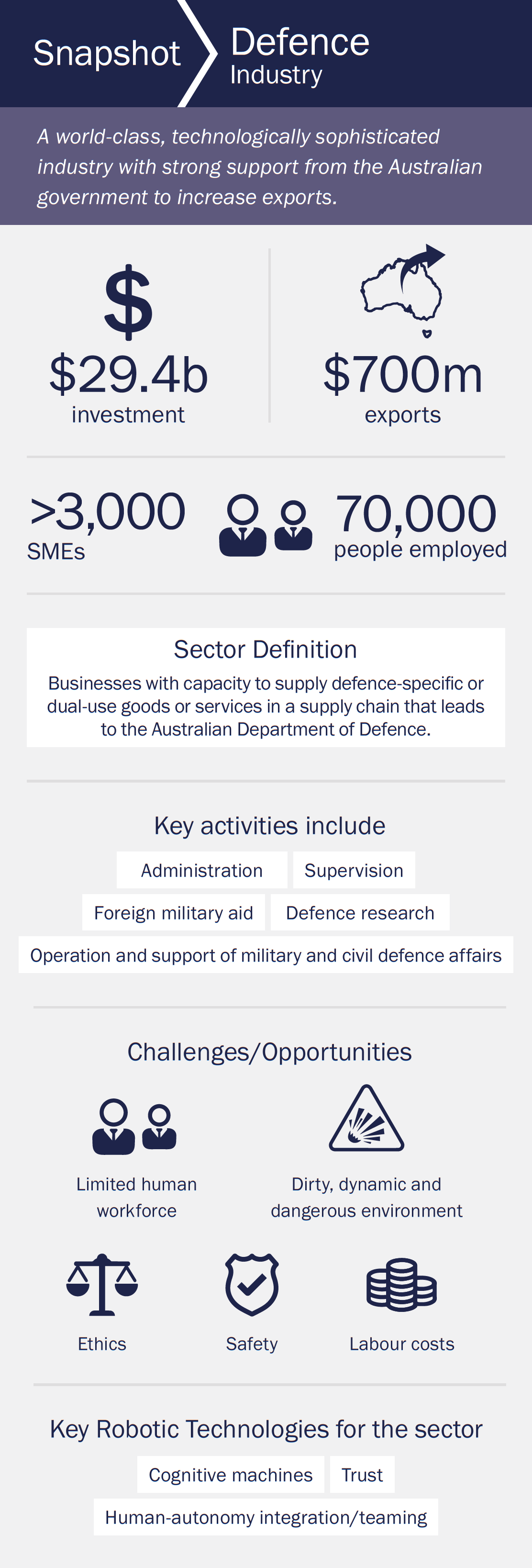 The Australian Defence Force (ADF) and the defence industry generally, refer to robotic systems as unmanned systems. This term applies to all forms of military, border patrol, national security and emergency response robots that keep humans out of harm’s way. Unmanned systems offer tremendous versatility, persistent functionality, the capacity to reduce the risk to human life, and an ability to provide contributing functionality across all key defence areas. These systems provide an increasingly valuable means of conducting a wide range of operations in uncertain, unstructured, and degraded environments. The ADF are now moving towards deployment of trusted autonomous systems (see Case Studies on p. 124 & 125).