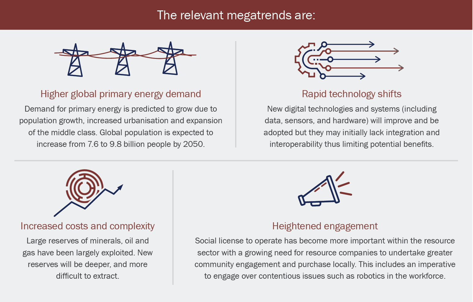 The nature and scale of activities in the resources sector sets it apart from other sectors. While the average life expectancy for Fortune 500 companies is only 15 years [BBC12], just the production phase from a mine site can continue for 40 years or more [AM17]. The resources sector also draws upon significant financial, human and natural resources due to the nature and scale of its activities. The impact on the resources sector from global megatrends identified by the CSIRO, will be partially addressed by robotic technologies [CS17].