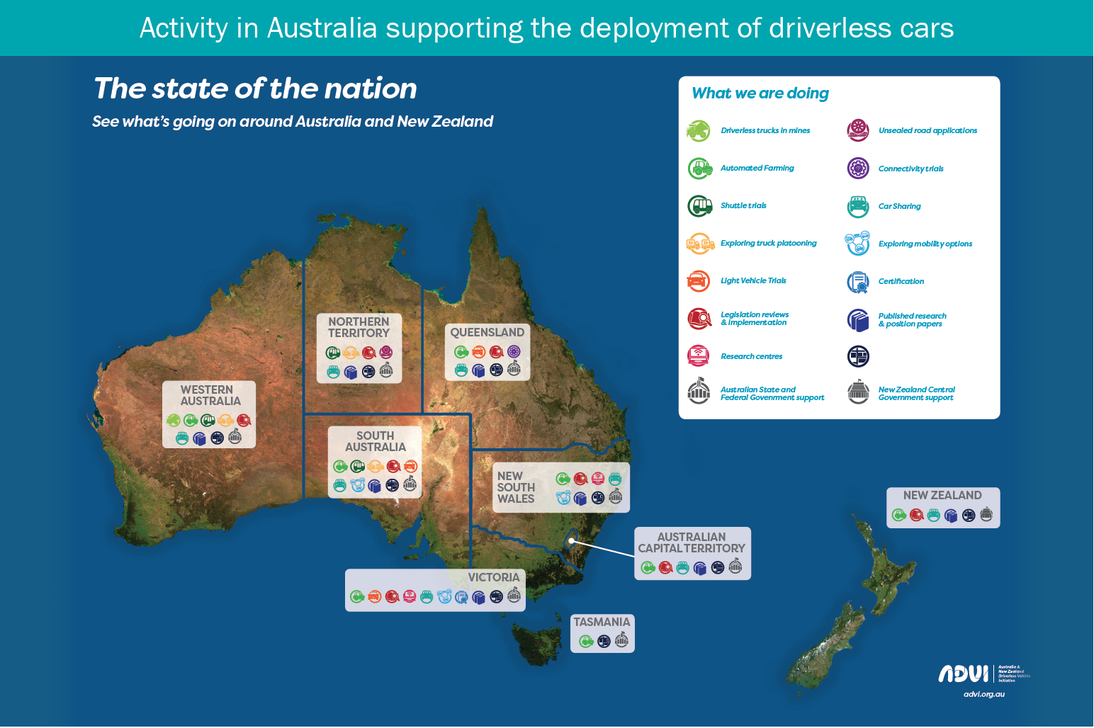 Given the lack of an automotive manufacturing industry, Australia’s primary role in preparing for connected and autonomous vehicles lies in supporting infrastructure, regulations and technological advancements. In Queensland alone, the Department of Transport and Main Roads estimates that 20 per cent of the state’s fleet will be autonomous between 2034 and 2045, increasing to 100 per cent between 2048 and 2057, with similar benefits expected for all Australian states. Globally, the development of a new passenger economy is predicted to be worth more than $US7 trillion by 2050 [SA17]. This figure is based on the development of new services, such as provision of self-driving car services (transportation, delivery) to consumers and businesses, as well as the development of new applications and services, and the social benefits of creating a time surplus.