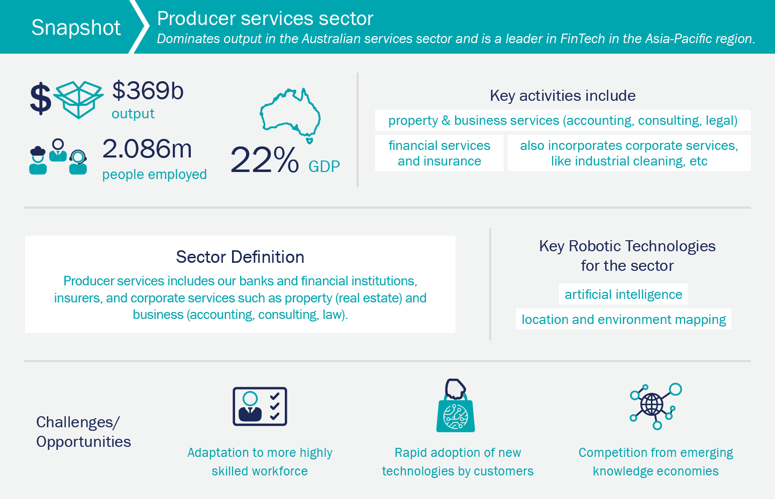 Producer services are the most valuable of Australia’s services, worth $AU369 billion of Australia’s GDP in 2016, the largest contributor to the national economy [ABS18]. Overall, producer services in Australia was worth 22 percent of GDP, employing more than 2 million people, and is expected to continue to be a core sector of Australia’s economy in the future [ABS18].